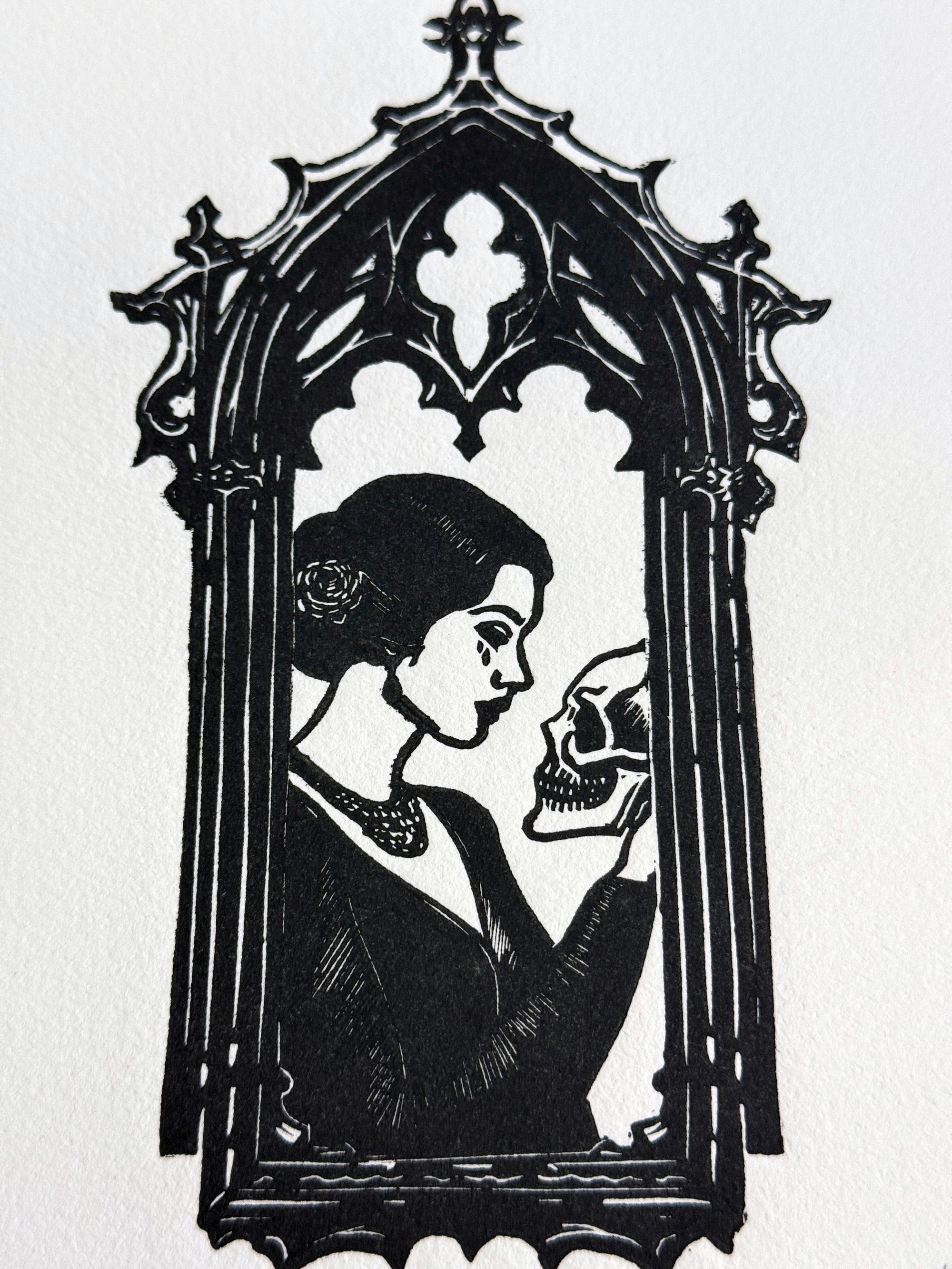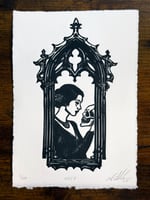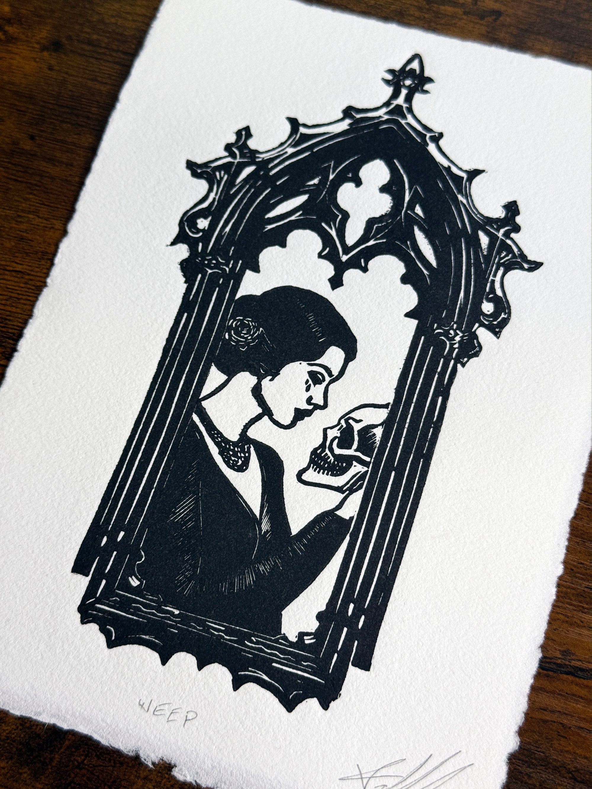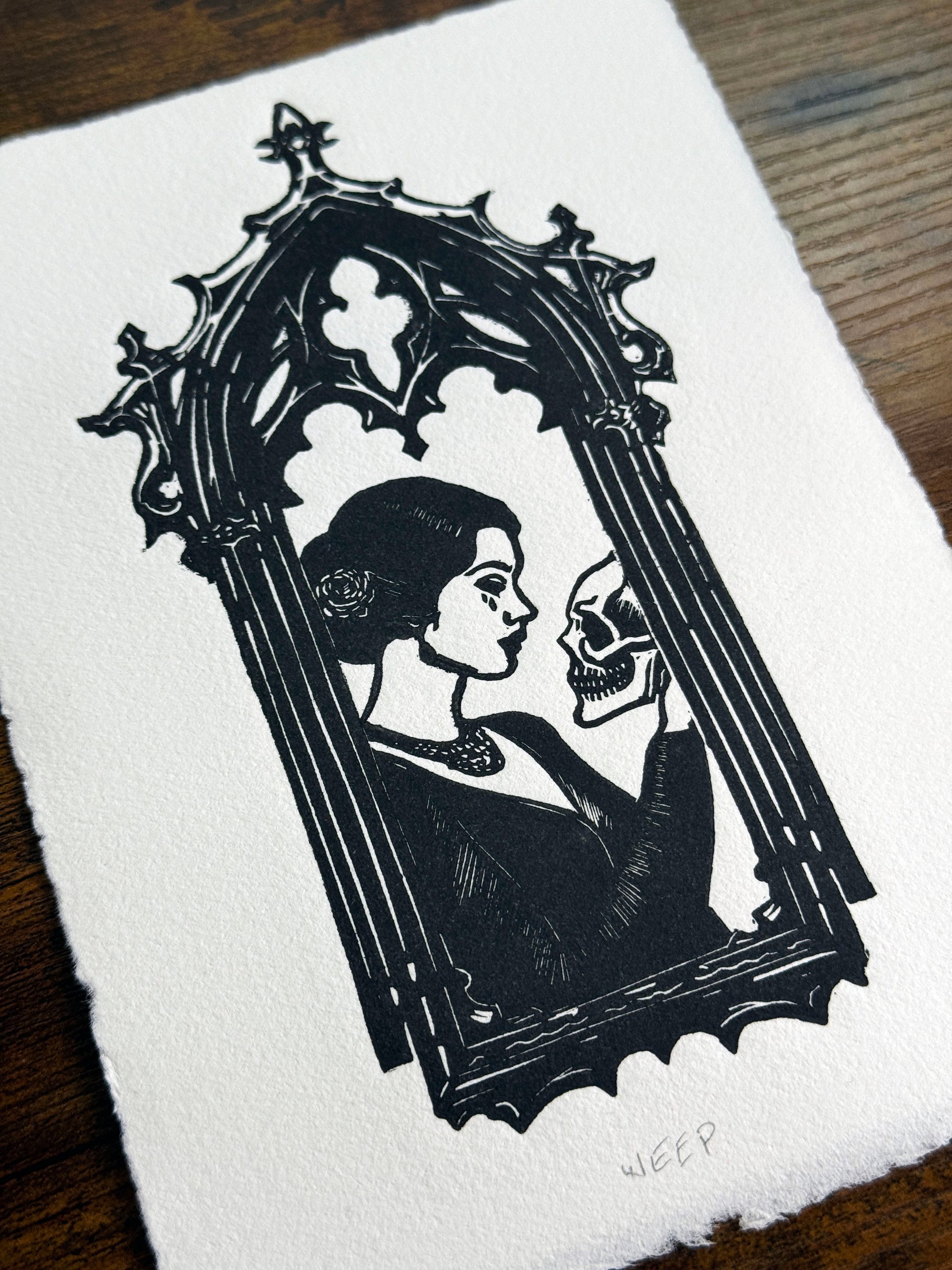 Hand-carved linoleum printing block printed with a hand-operated press.
